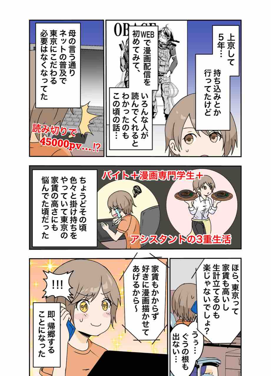 2023年04月05日 東京で生計立てる大変さ 東京で生計立てようと思って漫画を描きながらバイトやアシスタントを複数の場所でやりくりしてましたが、「家賃を稼ぐ為に働いて自分の漫画を描けない生活」になってしまい本末転倒でした。やっぱり「自分の漫画を描いて多くの人に読んでもらう」ことを何よりも優先せねば…!!!となったのでそもそも家賃のない生活は魅力的すぎた印象あります…短い短編漫画を詰めた「短編マンガ集」も無料で出ているよ!DLはコチラから⏬ < 前の記事次の記事 > コメント コメントフォーム 名前 コメント 記事の評価 リセット リセット 顔 星 情報を記憶 コメントを投稿する